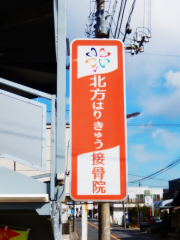 信号を渡るとすぐに左手にオレンジ色の看板「北方はりきゅう接骨院」があります。