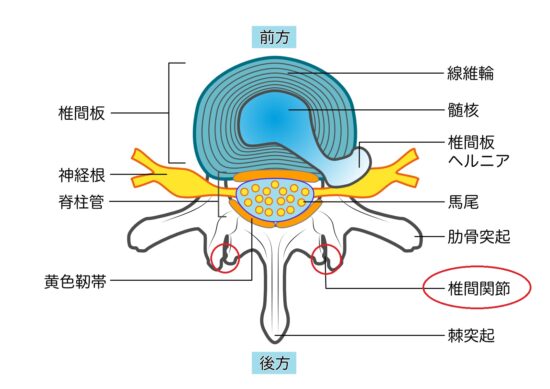 ②③左右にある椎間関節→猫背は椎間関節に負担増になり変形を招き椎間関節障害(腰を反ると痛い)が起きやすくなります。