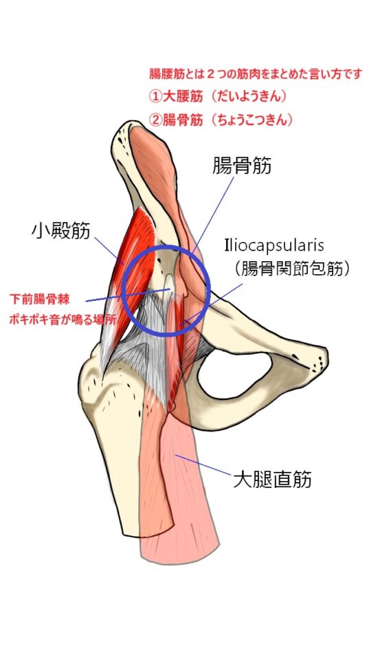 下前腸骨棘の出っ張りで腸腰筋(ちょうようきん)と擦れてなります。