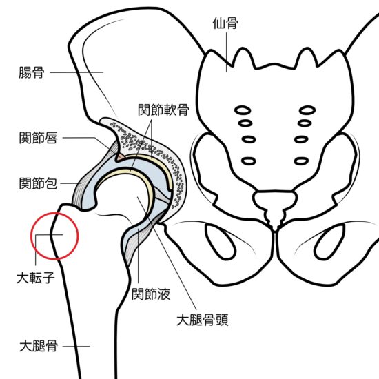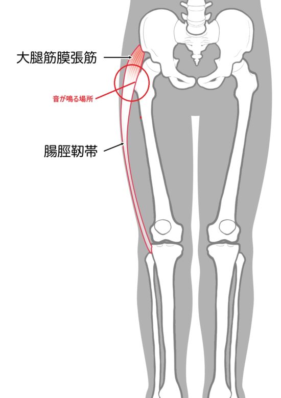 大腿骨の出っ張り(大転子)と大腿筋膜張筋で擦れて鳴ります。