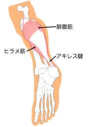 ふくらはぎの筋肉が合流: 腱の上部で、腓腹筋(ひふくきん)とヒラメ筋(ひらめきん)という二つの大きな筋肉が一つに合流します。