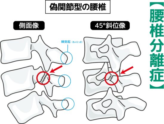 ただし、どちらも「腰を反る動作」で起こるため、「棘突起が痛いと思っていたら、実は奥で分離症も起きていた」というケースが非常に多いです。