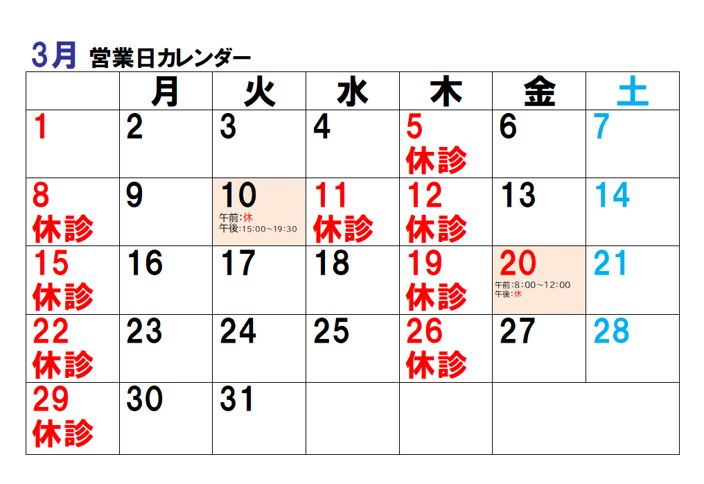 3月営業日、お休みのお知らせ