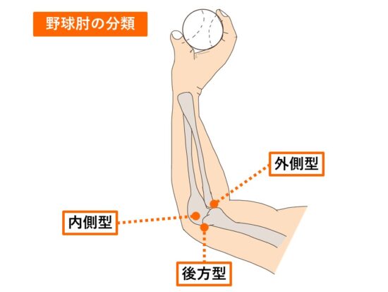 野球肘では①尺骨神経炎(しゃっこつしんけいえん)、②肘部管症候群(ちゅうぶかんしょうこうぐん)