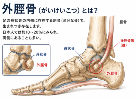 足の内側にある舟状骨(しゅうじょうこつ:足の内側アーチを構成する骨)の内側に存在する“余分な骨”(副骨)とも言います。